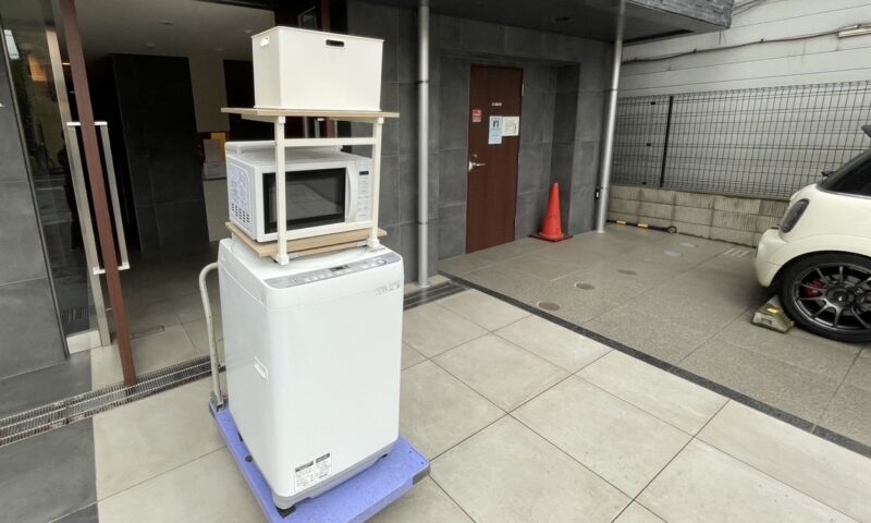電子レンジやラックなどをバランスよく台車にまとめて積むことで、